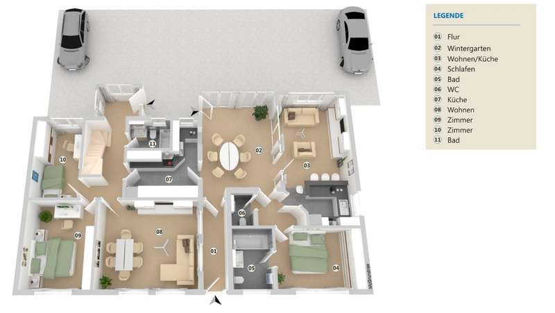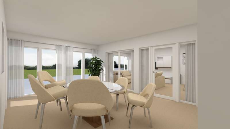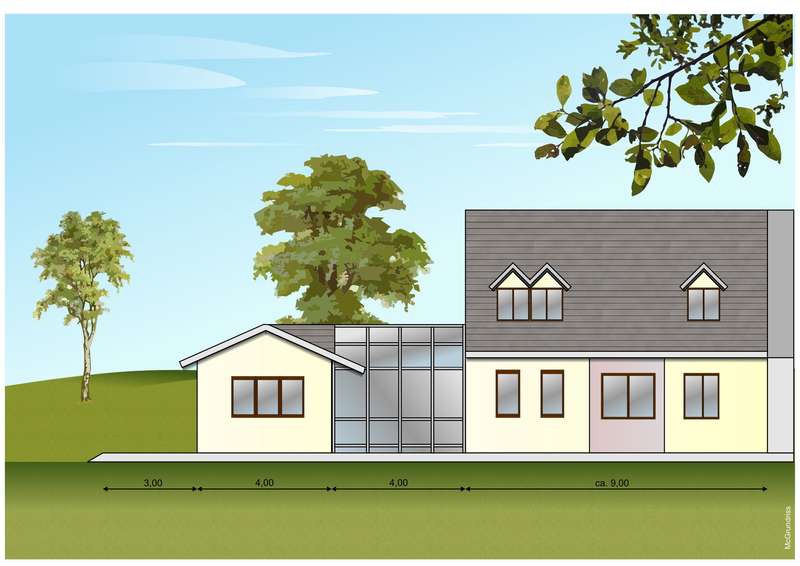 Domizil für mehrere Generationen. Die erste Möglichkeit besteht im Erhalt und der Sanierung der bestehenden Bausubstanz. Daran ergänzend geht der Architektenvorschlag von der deutlichen Erweiterung der Wohnfläche durch einen eingeschossigen Anbau aus. Dieser enthält einen Wintergarten sowie eine weitere komplette Wohnung.