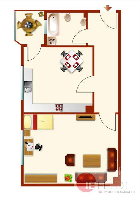 Die fast stufenlos erreichbar Erdgeschosswohnung ist sofort bezugsfrei. Sie besteht auf rd. 44 Quadratmeter Wohnfläche aus zwei Zimmern, einem kleinen Wannenbad, einer kleinen separaten Kochnische, einem großzügigen Flur sowie einem Kellerraum. Der G