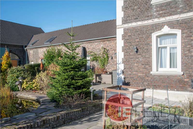 Eingerahmt wird das Grundstück durch einen Garten mit Teich und Terrasse auf der einen Seite und durch einen drei Meter breiten Grundstück-Streifen auf der anderen Seite.