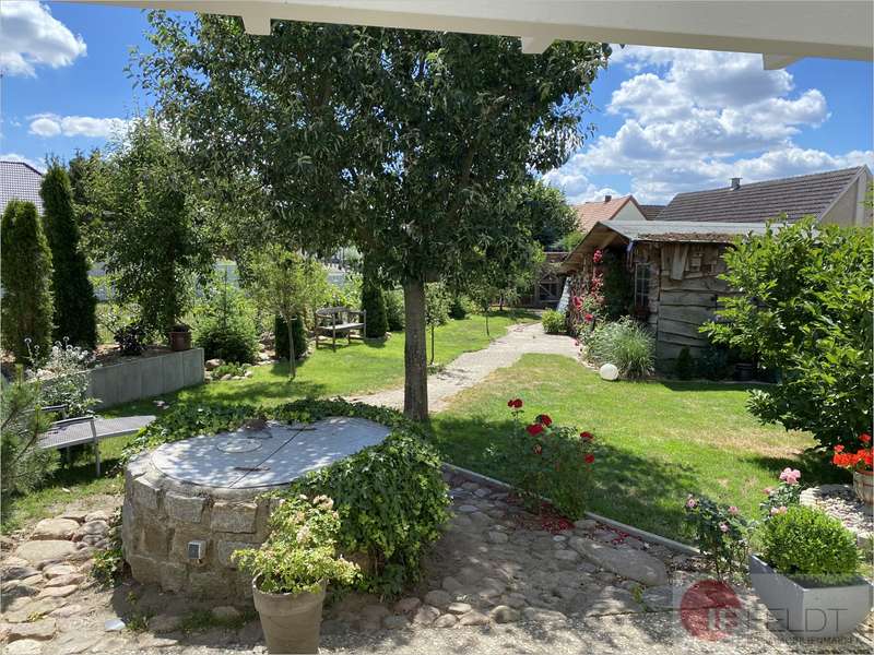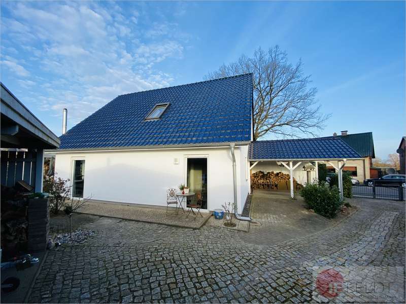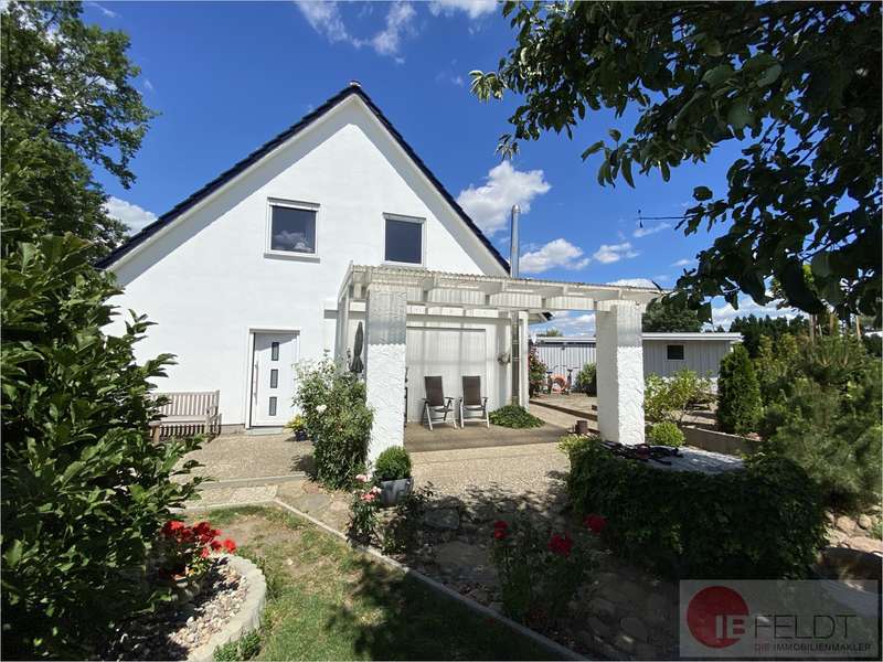 Bei der Immobilie handelt es sich um ein ca. 825 m² grosses Grundstück, dass mit einem in massiver Bauweise errichteten Einfamilienhaus aus dem Baujahr 2000 bebaut ist. Die insgesamt 125 m² Wohnfläche verteilen sich auf das Erdgeschoss und einem ausgebauten Dachgeschoss. Im Erdgeschoss befinden sich eine großzügige Diele, eine zum Wohnraum hin offene Küche, ein Hauswirtschaftsraum sowie ein WC mit Dusche. Das lichtdurchflutete Wohnzimmer mit einem Zugang zur Terrasse ist mit einem Kamin ausgestattet. Das Obergeschoss verfügt über zwei Schlafzimmer, eine Wohndiele sowie ein Vollbad.