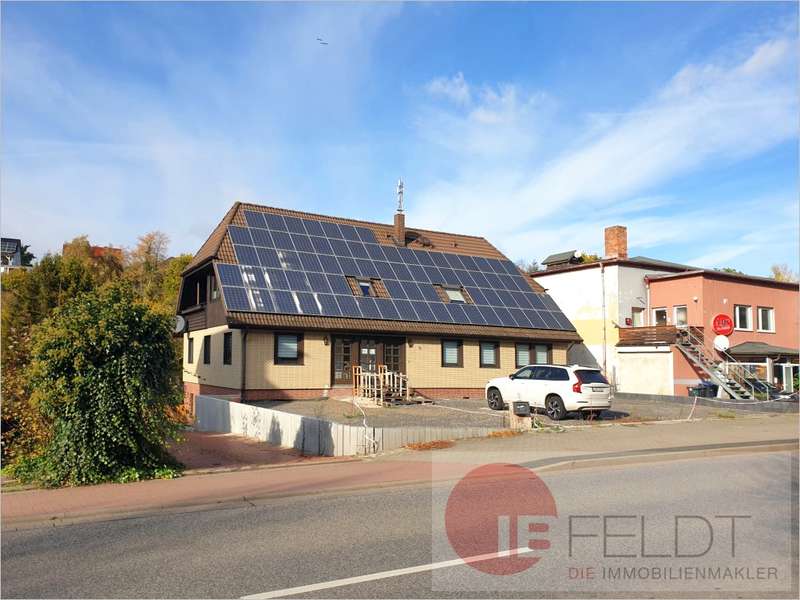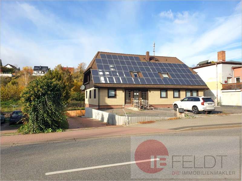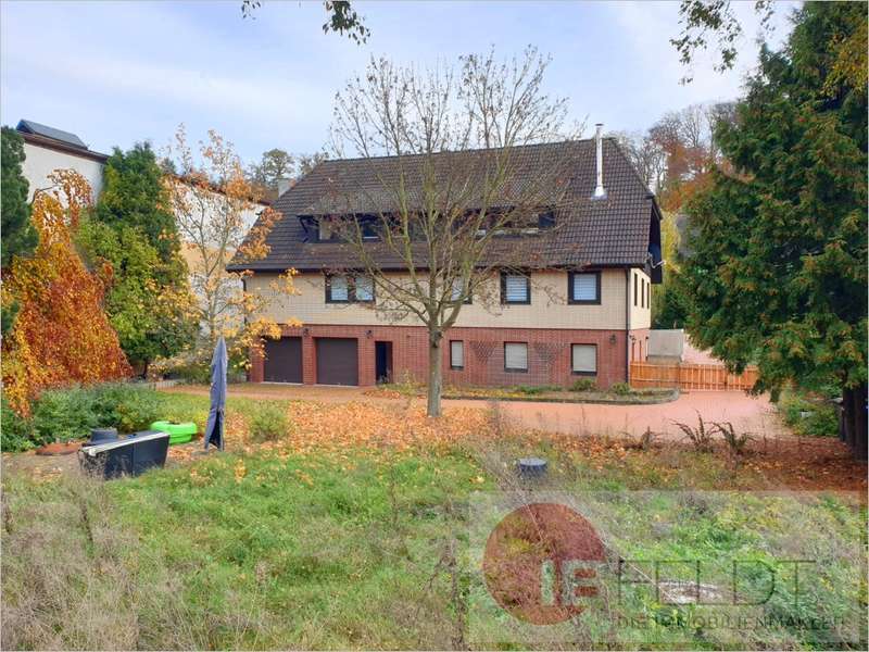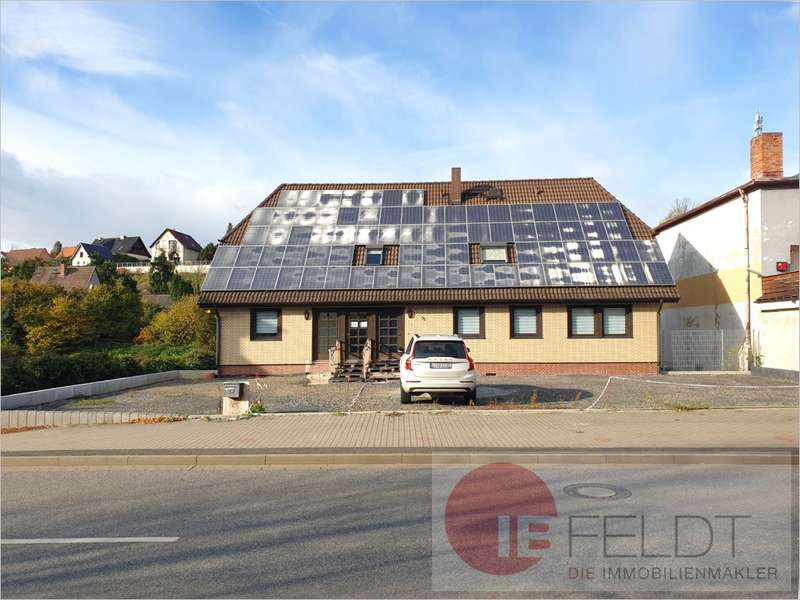 Bei der angebotenen Immobilie handelt es sich um ein ca. 2.120 m² großes Grundstück, bebaut mit einem um 1992 in Massivbauweise errichteten, unterkellerten, zweigeschossigen Wohn- und Geschäftshaus mit integrierter Doppelgarage, straßenseitigen Freiflächen mit Parkmöglichkeiten für ca. 6 PKW sowie rückseitig geschützt gelegenem Gartenbereich mit Terrasse.