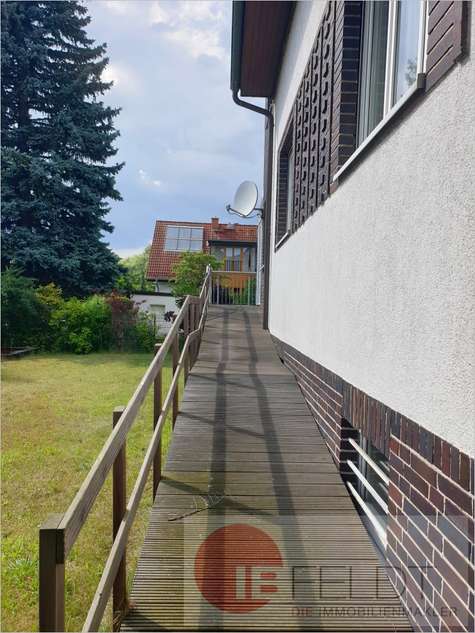 Der Wintergarten im Erdgeschoss ist mit elektrisch bedienbarer Verschattung ausgestattet. Zum barrierefreien Zugang des Gartens vom Wintergarten aus ist eine rückbaubare Rampe in Holzbauweise mit geringem Anstieg auf die vorhandene Außentreppe aufgebaut worden.