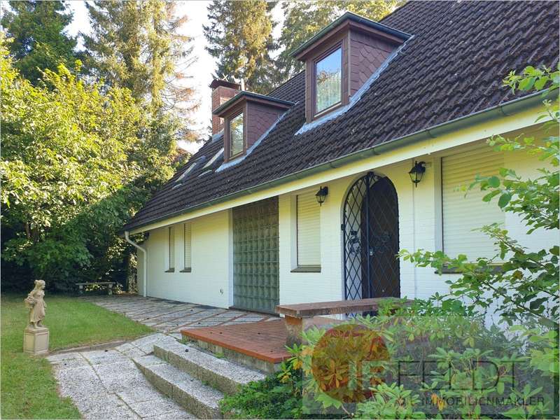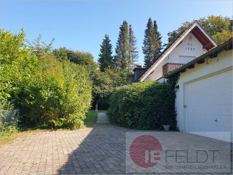 Bei der angebotenen Immobilie handelt es sich um ein ca. 1.868 m² großes, liebevoll angelegtes Anwesen direkt am Waldrand. Durch den besonderen Grundstückschnitt in Pfeifenform sind Wohnhaus und Gartenbereich nahezu uneinsehbar. Die gepflasterte Auffahrt ist durch ein elektrisches Tor gesichert, lässt sich ansprechend individualisieren und führt direkt zu zwei Garagen, welche sich seitlich vom anschließenden Wohnhaus befinden. Platz für ein oder zwei weitere Fahrzeuge ist vor den Garagen ebenfalls vorhanden. Über einen schön gestaltbaren Vorgarten gelangt man zum Hauseingang, ein paar Schritte weiter zum seitlichen Gartendurchgang.