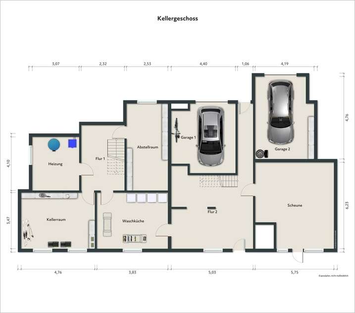 Der Keller ist nicht zu Wohnzwecken ausgebaut und fungiert, abgesehen vom Heizungsraum, der Waschküche und Werkstatt, in erster Linie als Lagerraum.