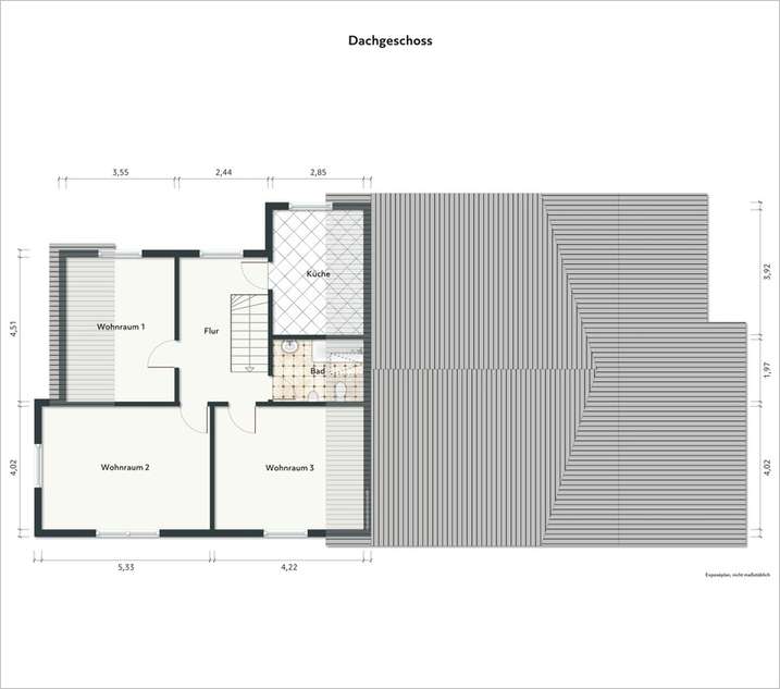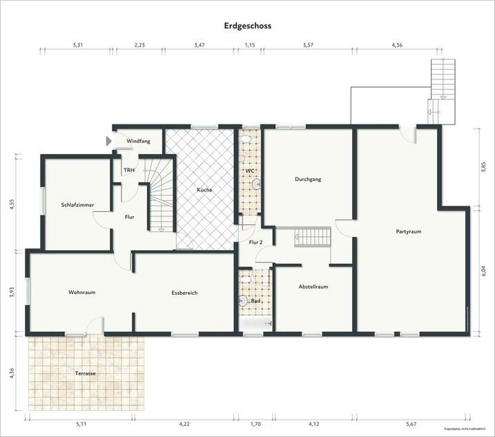 Im Erdgeschoss wurde ein großer Partyraum mit insgesamt knapp 44m² Wohnfläche bereits vollständig zu Wohnzwecken ausgebaut. Auch ein weiteres Badezimmer sollte neben dem besagten Partyraum noch eingebaut werden. Allerdings wurde dieses Vorhaben aufgrund des Verkaufs vorerst auf Eis gelegt. Somit wird das Nebengebäude, abgesehen von dem besagten Partyraum, ausschließlich als Nutzfläche berücksichtigt.