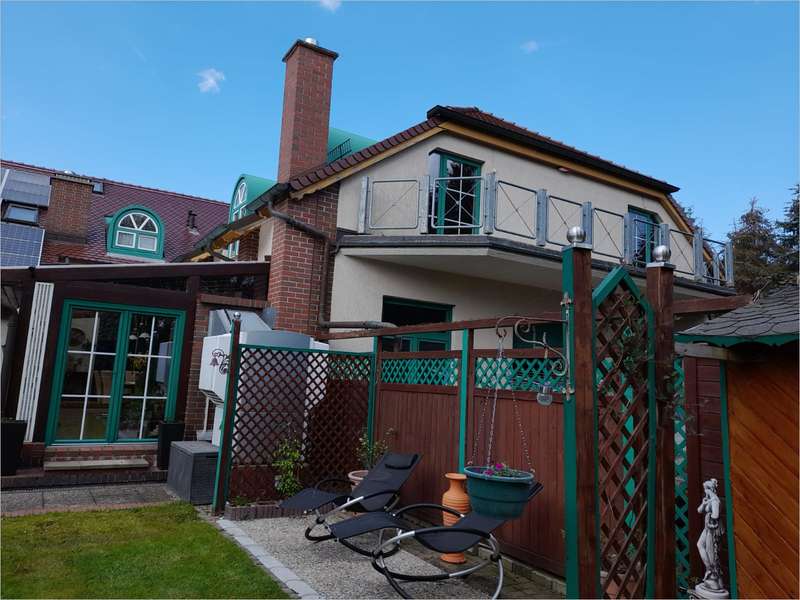 Auf dem vollständig eingefriedeten Grundstück befinden sich des Weiteren zwei Doppelcarports, ein kleinerer Carport, ein ca. 25 m² großes Gartenhaus sowie eine 50 m² große Terrasse mit Grillanlage. Eine Gartenwasseranlage mit eigenem Brunnen sichert die Wasserversorgung ab.