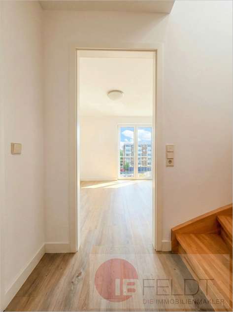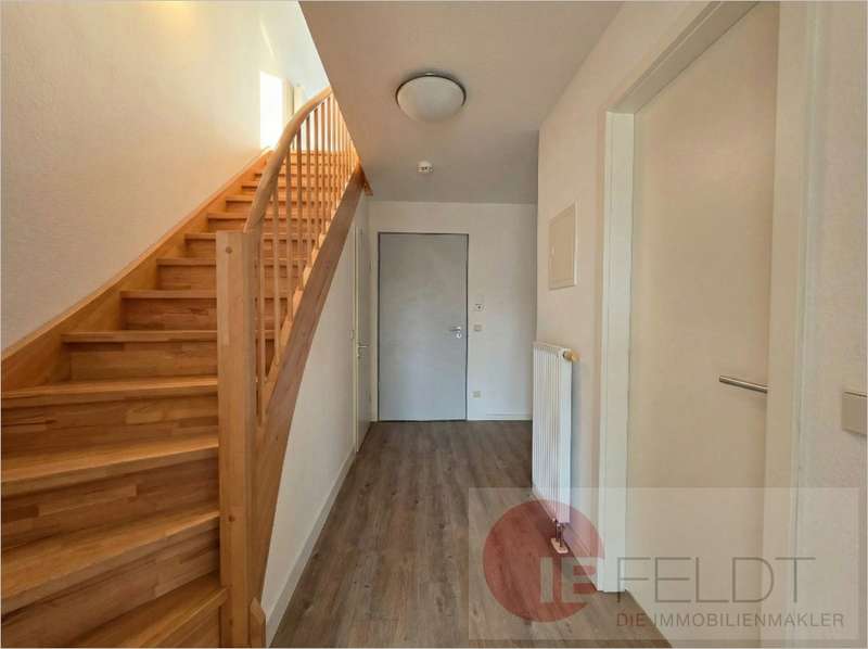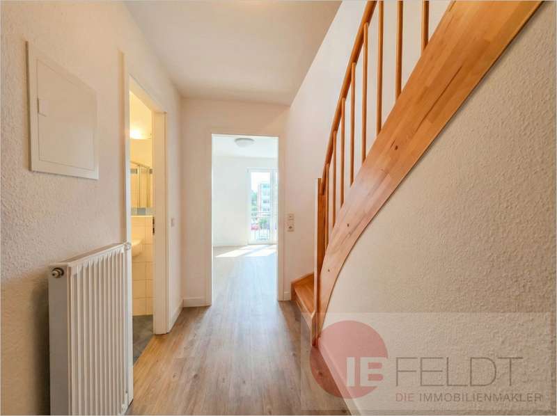 - einen Flur mit Treppenaufgang und darin integrierter Abstellkammer