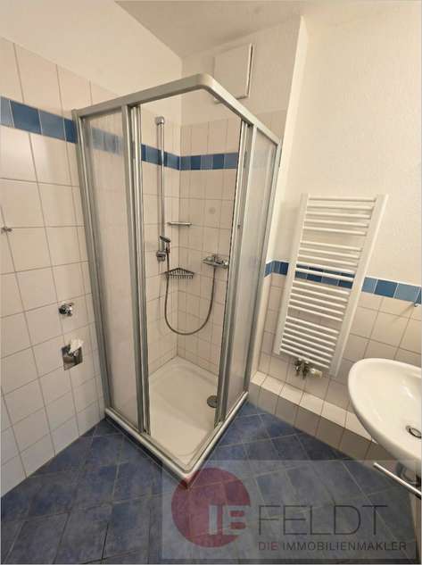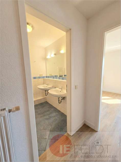 - das Bad mit Dusche, 2 Waschtischen, Spiegel, Handtuch-Trockner & Waschmaschinen-Anschluss