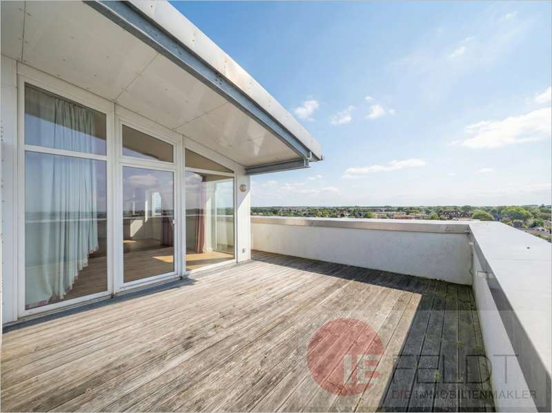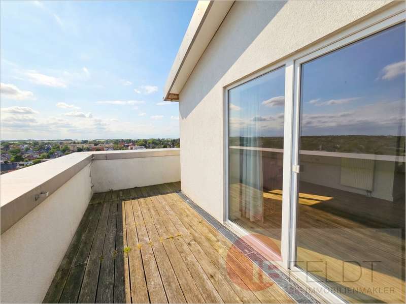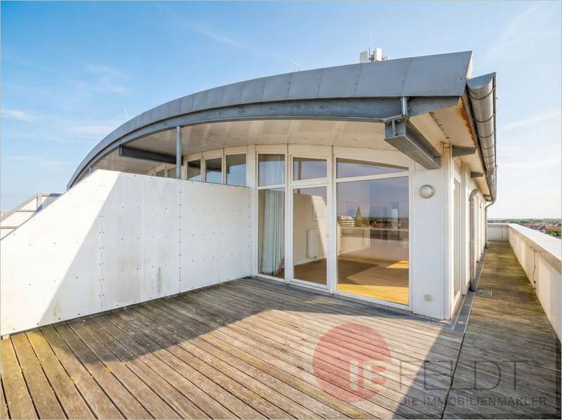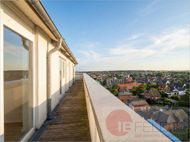 Das Highlight ist zweifellos die umlaufende ca. 47,69 m² große Dachterrasse (Süden/Osten/Norden), welche vom Wohnzimmer wie auch vom Schlafzimmer aus zugänglich und perfekt ausgerichtet ist. Da Sie sich auf dem höchsten Gebäude der Umgebung befinden, haben Sie von hier aus exklusiven Weitblick über Sylt - bei schönem Wetter bis nach Amrum und Föhr.