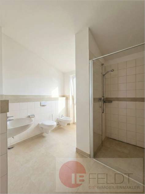 - ein Tageslicht-Bad mit Dusche, Waschtisch, großem Spiegel, Handtuch-Trockner, WC und Bidet